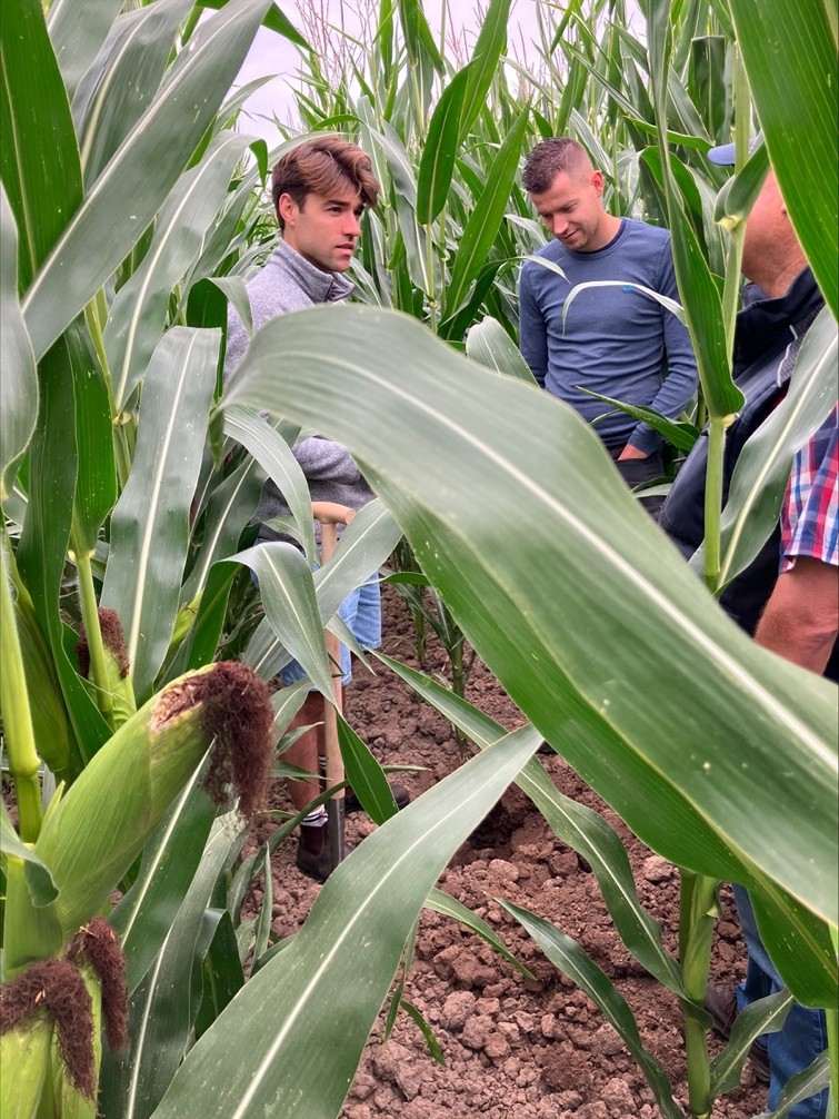 Tussen de maïshalmen ging het gesprek verder over organische stofafbraak, optionele groenbemester samenstelling, gras-klaver en grondbewerking. Ook Pierre’s zoon luisterde geïnteresseerd mee. Tijdens het gesprek over het perceel sparren Bart en Pierre over mogelijke vervolgstappen om de bodem te verbeteren. Uitkomst was om na de oogst onder goede condities te woelen om de verdichting die er nog zat los te maken. Daarna kan hij in één werkgang een diepwortelende groenbemester zaaien, waarmee hij de bodem verder verbetert en de mechanisch ingebrachte structuur ook vastgelegd kan worden door de levende wortels. We zijn erg benieuwd hoe het perceel er komend voorjaar bij ligt!