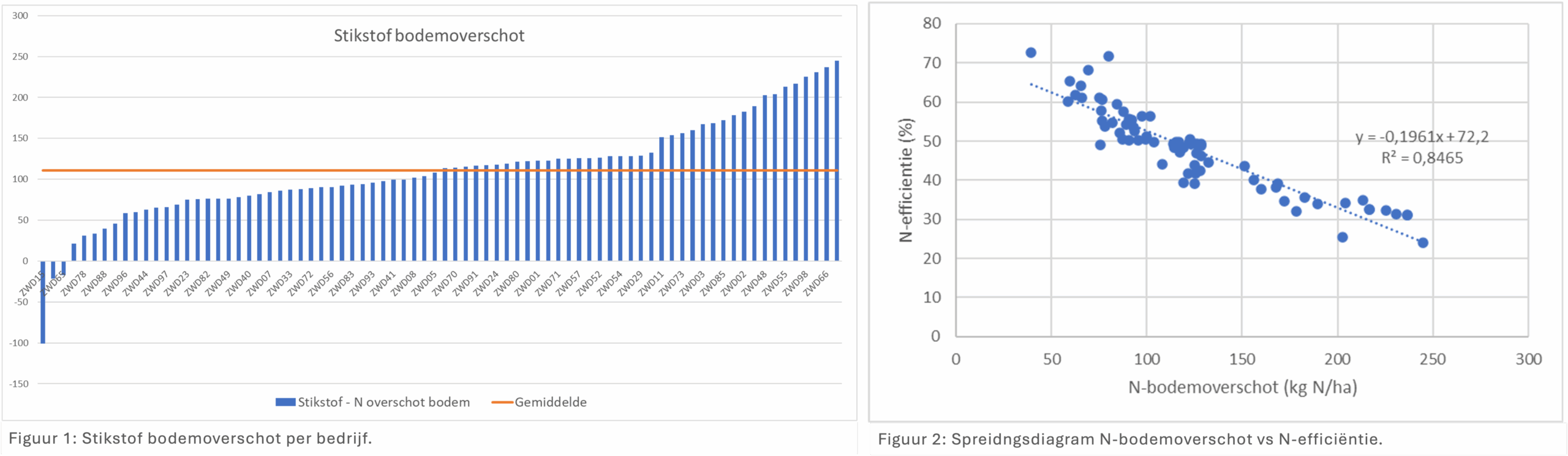 Een belangrijk onderdeel van de bijeenkomst was het bespreken van de KPI stikstofbodemoverschot. Dit gesprek werd geleid door David de Wit, onderzoeker bij Wageningen University & Research (Open Teelten) en deelnemer aan het project. Hij verzorgde tevens de toelichting op de meest recente en relevante wetenschappelijke inzichten rond stikstofgebruik, efficiëntie en opbrengstrelaties. Uit de data bleek een grote spreiding onder de deelnemers, van -100 kg N/ha tot +250 kg N/ha (Figuur 1). Deze spreiding werd verder geanalyseerd op basis van correlaties. Zo werd een (zwakke) positieve correlatie vastgesteld tussen stikstofbodemoverschot en ammoniakemissie (richtingscoëfficiënt = 3,59; R² = 0,10) en een sterke negatieve correlatie tussen stikstofefficiëntie en stikstofbodemoverschot (richtingscoëfficiënt = -0,19; R² = 0,84) (Figuur 2).